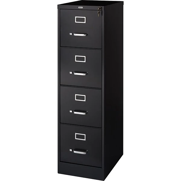 Create a reliable file organization system with this vertical file cabinet. Four spacious drawers let you arrange files by date, name or year, and the aluminum label holders hold cards for easy file sorting. The precision ball bearing drawer glides allow for smooth movement as you open and close each drawer, providing convenient access to your most important paperwork. A core removable lock keeps files neatly stored away while also allowing for fast, easy lock replacement. The upright design offers a space-saving option for bulk file storage, making this cabinet ideal for use in small offices or file rooms. Featuring adjustable wire followers, this vertical file cabinet comes equipped to accept hanging file folders.