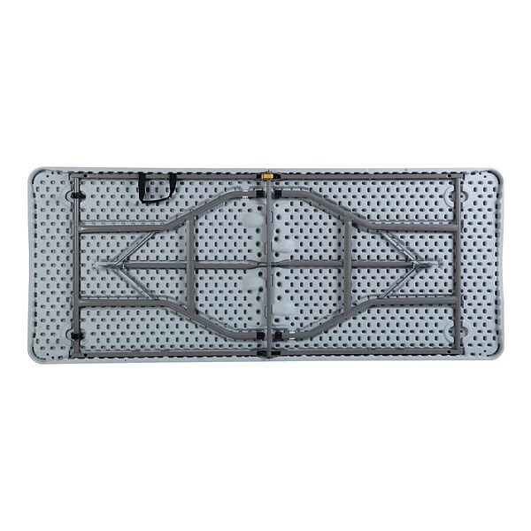 Create temporary seating or workspace with this bi-fold table. Steel tube legs provide added durability, and each leg has a rubber foot cap to protect floors from scuffs and damage. A white granite and charcoal color scheme bring a professional look to meetings or events, while the durable tabletop resists scratches and stains for long-lasting use. The simple design folds in half between uses, making this indoor/outdoor table easy to stash in a supply closet or storage space.
