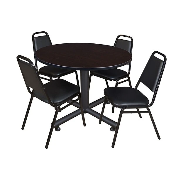 This Regency Training and Hospitality round mocha walnut laminate table has a thermally fused melamine laminate top for ultimate stain resistance. It features a black tubular steel post and includes four stacker chairs with black vinyl.