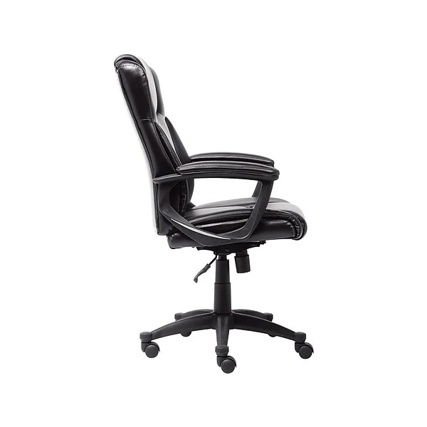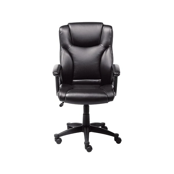Adjust this supple black bonded leather executive office chair for optimal support while you work. The armrests are padded to provide comfort for forearms while helping reduce shoulder strain, and the waterfall cushion design helps promote blood circulation for long days at your desk. Thanks to the five dual-wheel casters, this chair makes rolling around your workstation smooth and simple, while the five-star base spreads out the weight for minimal impact on flooring. The upholstery is made with black leather to deliver a sophisticated, executive appearance. This Serta executive office chair features thick pillows and contoured lumbar support for your lower back, so sitting for extended periods of time is a comfortable experience.