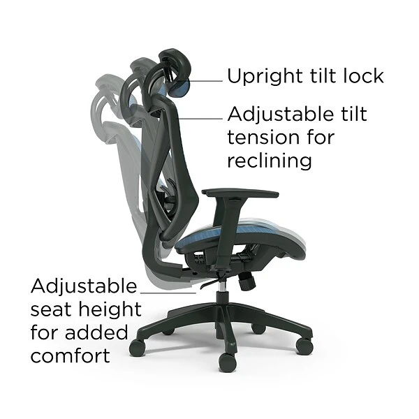 Complete your office setup with this task chair. The breathable mesh back and seat allow free air circulation to keep you cool on hot days, while the back tilt tension knob lets you adjust the reclining resistance for proper posture. Featuring an upright tilt lock, this chair allows bolting the back in a vertical position, so you can concentrate on the task at hand, and the adjustable headrest supports your upper body. A stable base and casters support effortless movement from your desk to the printer. This FlexFit Dexley blue mesh task chair meets ANSI/BIFMA standards for reliable performance and safety, and the adjustable lumbar support gives you customized lower-back support.