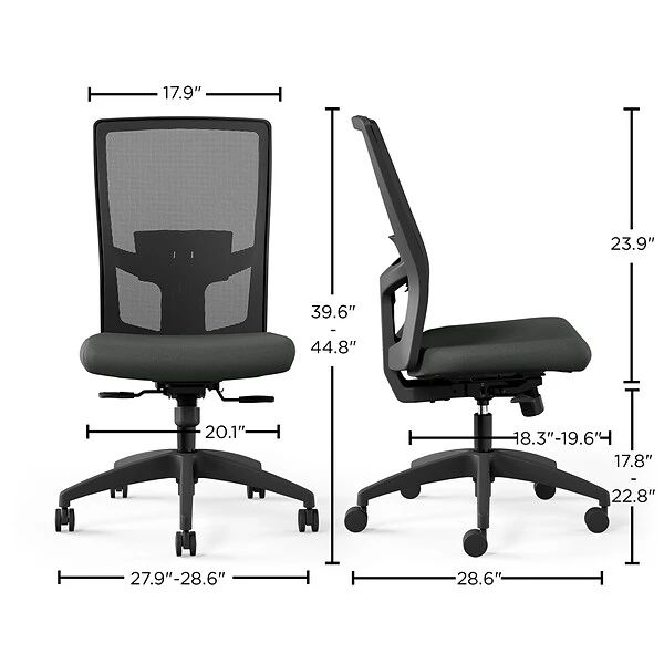 - Overall Dimensions: 39.6 – 44.8″ H x 27.9 – 28.6″ W x 28.6″ D ; Seat Depth: 18.3 – 19.6″, Seat Width: 20.1″, Seat Height: 17.8 – 22.8″, Back Height: 23.9″, Back Width: 17.9″