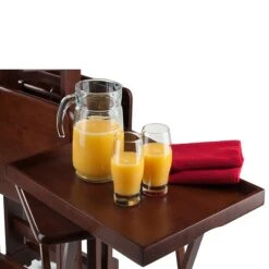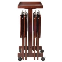 Perfect for entertaining or relaxing on the patio or in front of the TV, each table opens to a generous 19″W x 14.5″D, providing plenty of room for a meal, snacks and drinks. The storage stand rolls easily on casters, two of which lock to keep the unit stable. Made of Solid Wood in a Walnut finish.