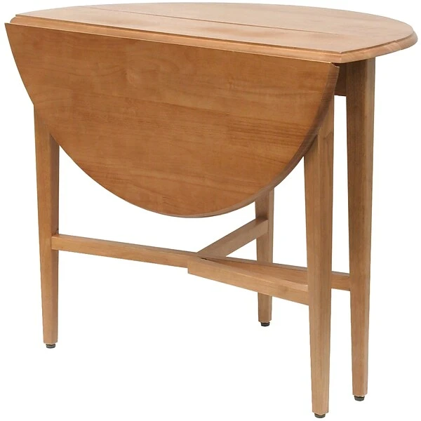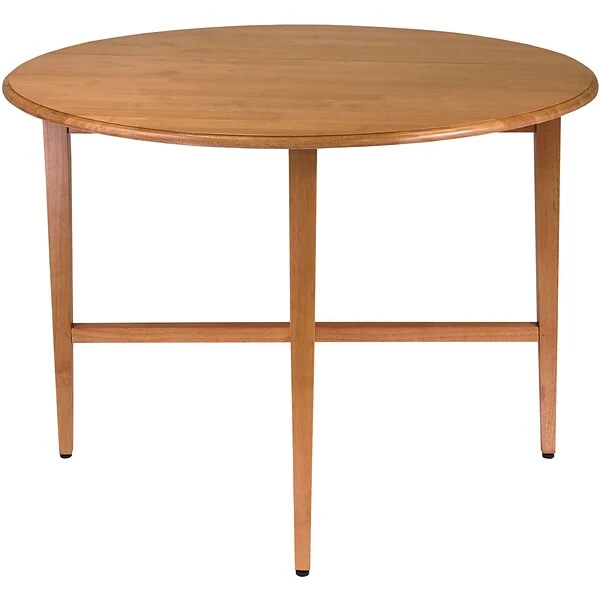 This Winsome Wood 42″ Round Double Drop Leaf Table is ideal for small dining areas or work spaces. Made of solid and composite wood, the table’s two leaves fold out to make room for four. With a beveled edge table top and slender, tapered legs, the table looks graceful, while providing plenty of support without bulk. With just one leaf up, the table works well in small spaces like studios or kitchen breakfast areas. To store, simply put both leaves down and fold the crossed support rails. Comes fully assembled. (Model #34942)