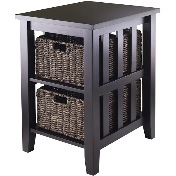 Winsome Morris side table made of solid wood with espresso finish enhances high durability and classic look.Table features 2 shelves provided to store 2 foldable baskets made of cornhusk ideal for storage stuffs and needs some assembly to setup.