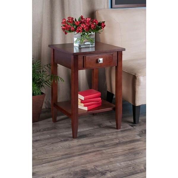 Winsome Richmond end table with tapered leg has solid and composite wood construction for durability and comes in an elegant antique walnut finish.Table features a drawer for enclosed storage of items and bottom shelf for display of accessories.